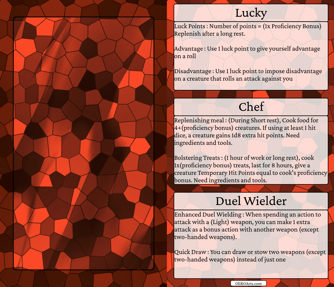 Available Cards (Type & Example) General Spell Card Custom Spell Card NPC card 1 NPC Card 2 Feats Item General Card A (Premium) Pouch (Premium) Spell Tracker (Premium) Inventory (Premium) Weapons (Premium) Combat (Premium) Blood Hunter Tracker (Premium) Bard Tracker (Premium) Ailments (Premium) Initiatives (Premium) Spell Schools (General Spell Card)